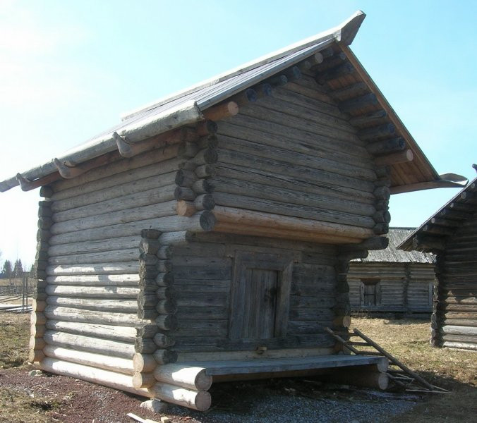In the plan barn’s log construction is a square with sizes on the axes 3,96 x 3,90 m and the projection of the zalobnik on 0,9 m. This construction is made of logs with a diameter of 23-26 cm with corners’ junction of wood "in oblo" (put up with the remainders). There is a platform (stage) of blocks in 1 m wide on the oblong prominent (salient) parts of longitudinal logs’ remainders of the side walls in front of this barn. Inside the barn is divided by flooring into two levels. There are suseki (chests for keeping grain) on the first floor. The various host’s things were stored on poles which were along the walls on the second floor of the barn.