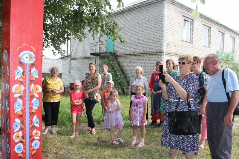 Заслуженный работник культуры Глебова Ангелина Аркадьевна обратила внимание всех на роспись, которой оформлен арт-объект. Свободно-кистевая роспись, созданная по мотивам работ творившего на этой земле мастера начала XX века Михаила Павловича Осетрова, по праву может служить узнаваемости территории, являясь маркером места.