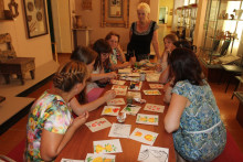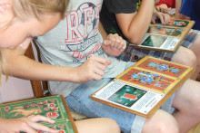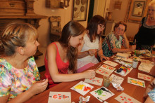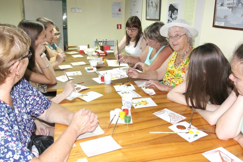 Пока взрослые под руководством народного мастера России Гладышевой Ольги Константиновны знакомились с отличиями свободно-кистевых и графических росписей, дети путешествовали в мир красоты с игровым кубиком в руках и ловко перемещали костяшки в попытке сложить изображения из отдельных фрагментов.