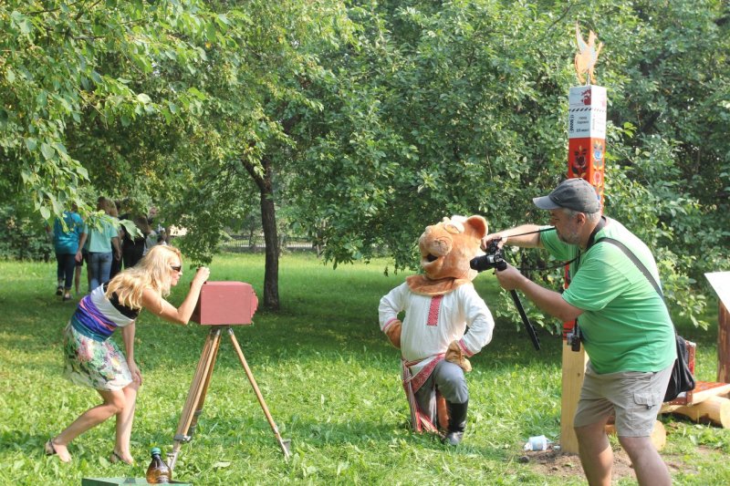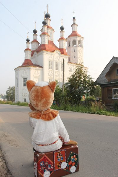 В лучах яркого солнца заиграла всеми красками тотемская роспись. Размашистые объёмные цветы на сурике и лев, напоминающий собачку, привлекли внимание и Кота Семёна. Неожиданно появившись из зарослей кустарника, он нацелил объектив фотоаппарата на роспись. Уже через мгновение появилась памятная фотография. Семён быстро нашёл ей место, прикрепив на крышку чемодана, с которым он в путешествии никогда не расстаётся, ведь там хранятся игры с росписями для детей и взрослых.