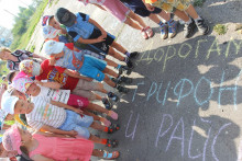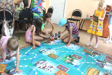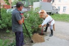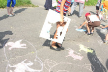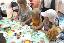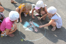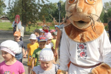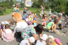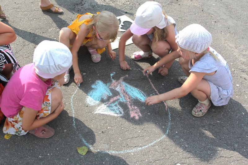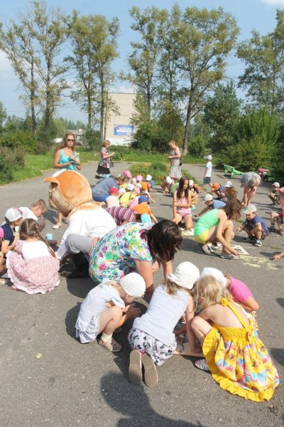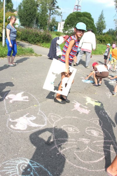 И вновь инициативу перехватил большой затейник Кот Семён. Он предложил всем сфотографироваться на память и, конечно, поиграть! В то время, пока народный мастер России Ольга Гладышева занималась с детьми и взрослыми изучением росписей, Кот развлекал дошколят. Ребята с большим усердием расцветили мелками асфальт. На одной из городских площадей вырос сказочный лес, в котором прячутся таинственные грифоны, отважные львы, фантастические сирины и кони. А чтобы им было не так одиноко, детвора нарисовала море солнышек, звёздочек, подселила к ним друга филина, а для пригляда за всем поставила Кота Семёна.