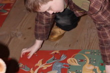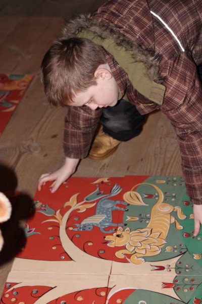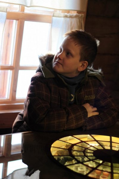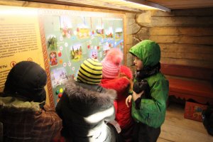 Дети быстро перехватили иннициативу от Кота Семёна, старались не сориться, отвечать на вопросы, без устали тестировали игровые модули. А взрослые меж тем обращали внимание на детали музейной экспозиции, на художественные работы мастеров, представленные в интерьерах крестьянской избы.