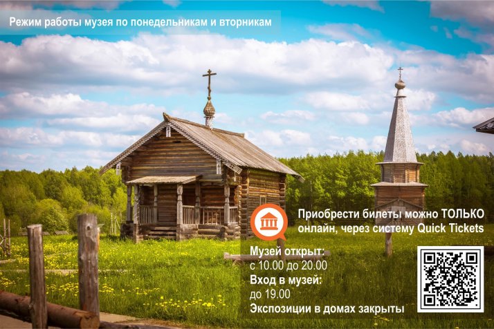 У вас появляется дополнительная возможность отдохнуть на лоне природы в понедельник и вторник, вдали от суеты и шума, разглядеть деревянные памятники в мягком вечернем свете и, конечно, оставить яркие фотографии на память о летней прогулке. К вашим услугам аудиогиды, высокие деревянные качели, карусель «гигантские шаги». Кому-то доставит удовольствие общение с лошадкой, гуляющей на просторах музея, а кто-то решит подремать под аккомпанемент звуков природы в свежескошенной траве. Вариант отдыха в музее подойдёт для романтических встреч и красивых признаний, для организации пленэра под открытым небом и просто как средство эмоциональной разгрузки после трудового дня.