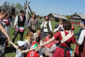 У высоких качелей было многолюдно. Парни в обмен на крашеные яйца качали девушек и кружили в плясках. Целовальные игры, хороводы, пение частушек под гармонь - всем этим жила деревня в прежние времена, всем этим живёт музей сегодня.