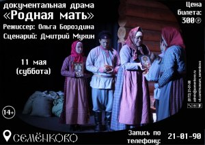 11 мая – открытие III театрального сезона в Антропологическом театре музея «Семёнково». Спектакль «Родная мать» (Бронирование билетов по ссылке).