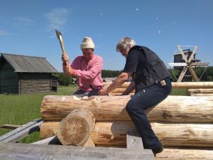 Зрители видят, как мужики скобелем обрабатывают древесину сруба. Для музейной истории ценно, что оказался запечатлённым строительный этап работ, связанный с возведением стен амбара будущей шатровой мельницы. Это ещё и старт работ на объекте в 2020 году.