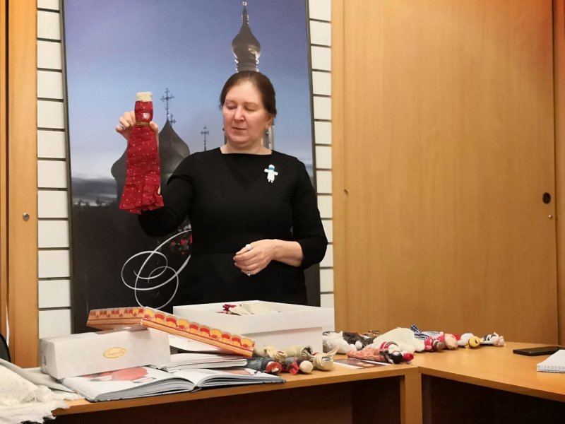 Хранитель коллекции кружева и тканей Надежда Александровна Кутекина познакомила сотрудников музея "Семёнково" с разнообразием крестьянской детской игрушки и особенностями её изготовления.