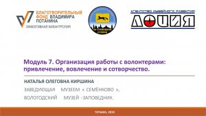 Заведующий музеем «Семёнково» Наталья Киршина приняла участие в работе Школы музейного развития «За границами столиц», которая прошла в Тотьме с 30 сентября по 5 октября 2019 года. Работа её поддерживается Благотворительным фондом Владимира Потанина (программа «Эффективная филантропия») и ориентирована она, прежде всего, на музейщиков из малых городов и сёл.