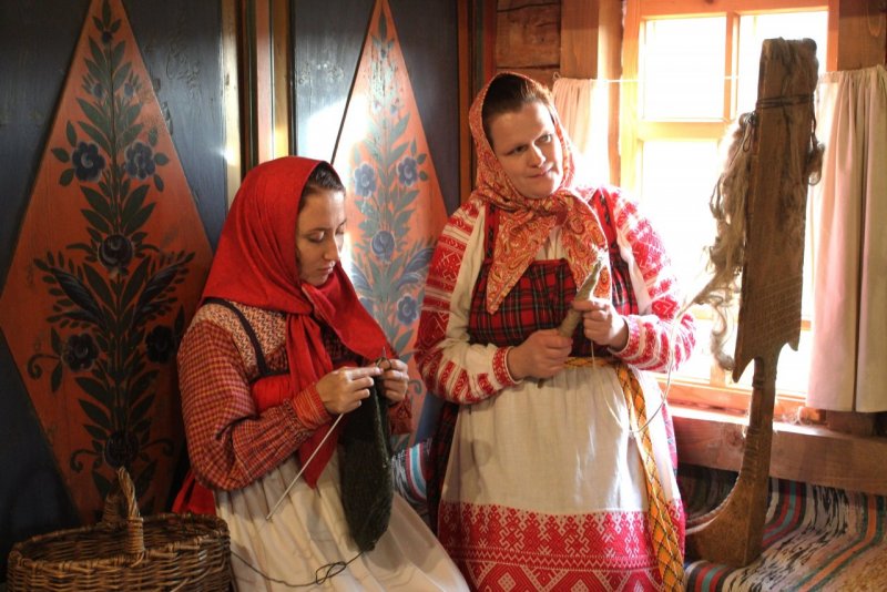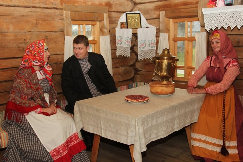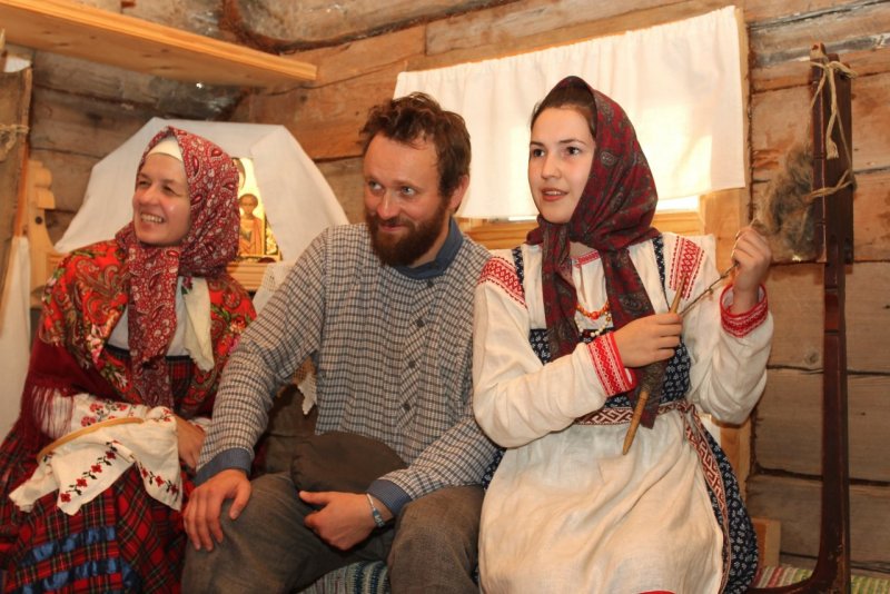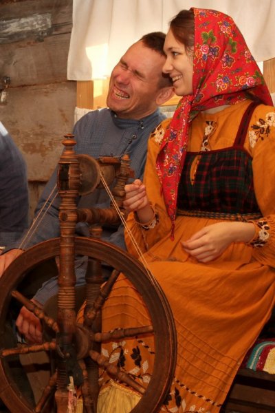 А в это время музей «Семёнково» потихоньку наполнялся людьми. Экскурсоводы подхватывали гостей «со всех волостей», увлекая в удивительное путешествие во времени. А чем жила деревня XIX века в осеннюю пору? У Жуковых прясть научились, у Поповых на посиделках поплясали да поиграли, Надежду к Валентину «припели», коновала повстречали, на сватовстве, на мастер-классах побывали, чай с блинами попивали.