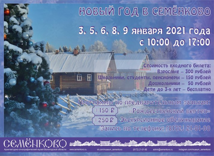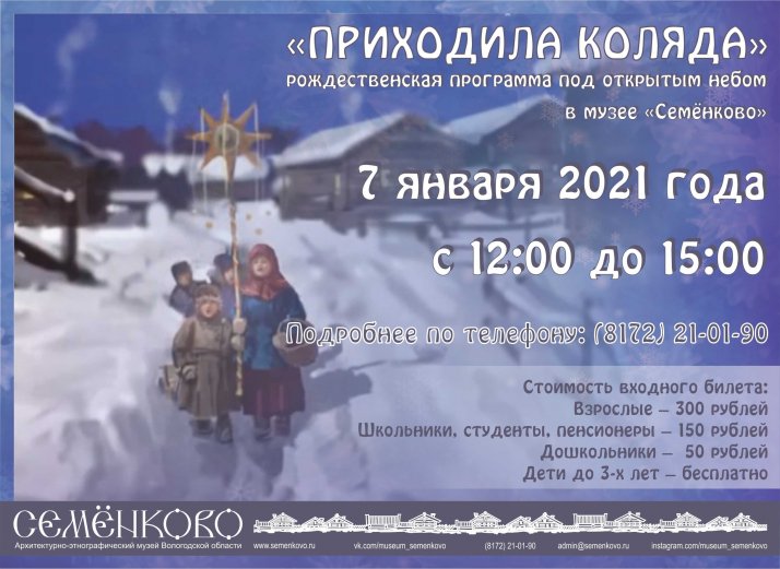 Музей продолжает принимать заявки от организованных групп туристов численностью до 15 человек на экскурсии, интерактивные программы: «Рождественский вертеп», «Святочные игрища». Приём заявок по телефону: (8172) 21-01-90.