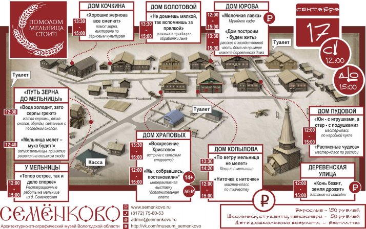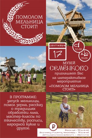17 сентября 12.00-15.00 в Архитектурно-этнографическом музее «Семенково» пройдет интерактивная программа в рамках закрытия летнего туристического сезона «Помолом мельница стоит»!