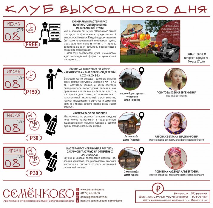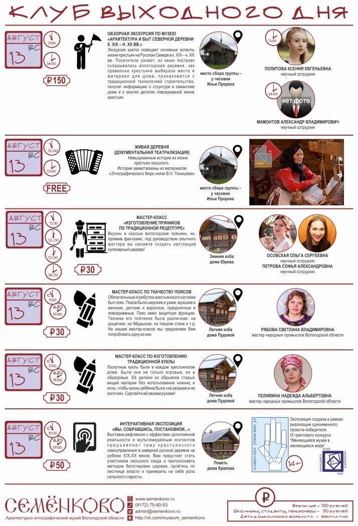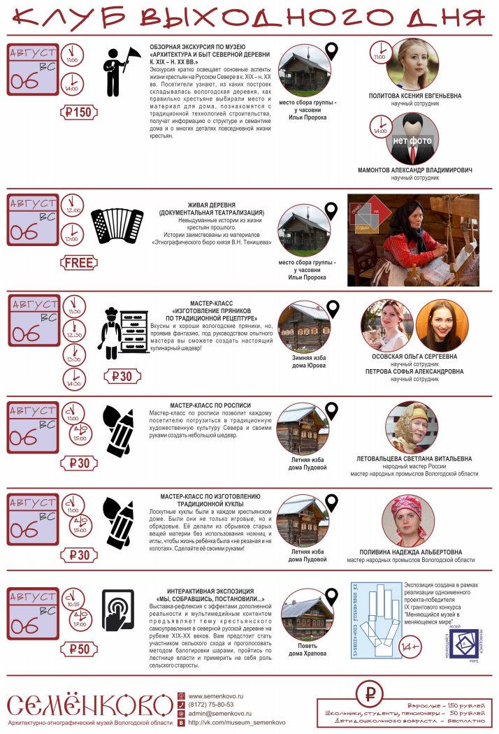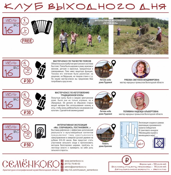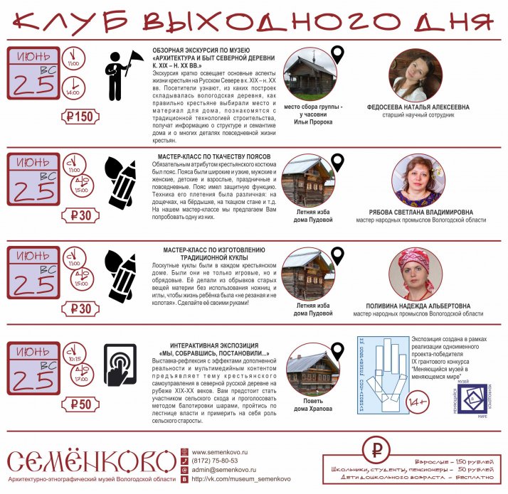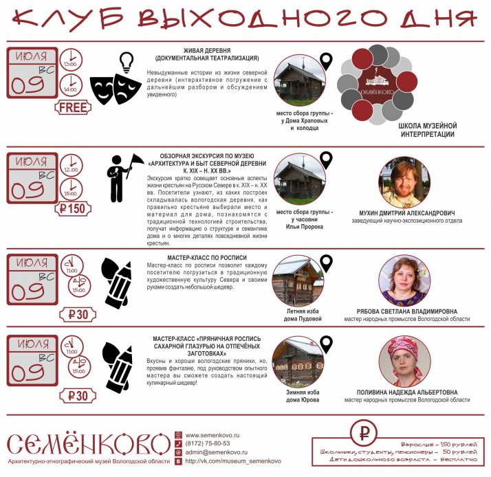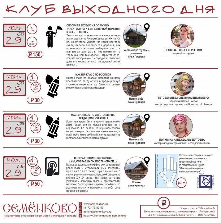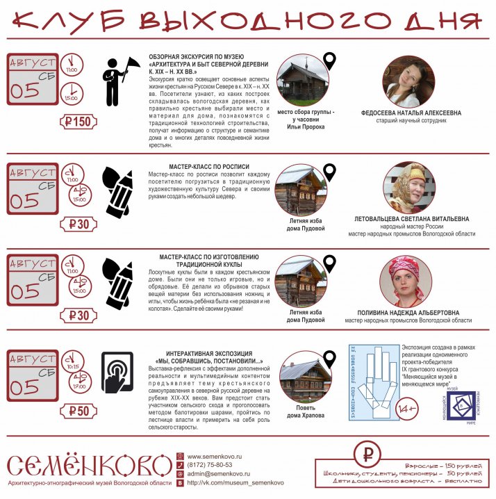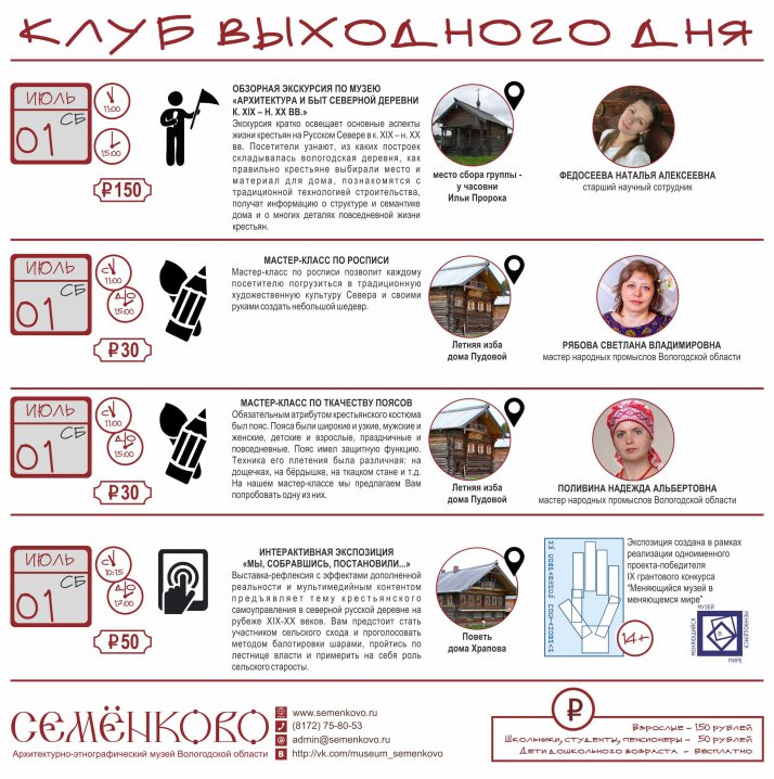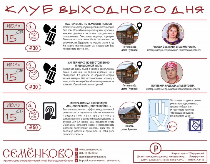 Кроме того каждые выходные для вас работают мастер-классы, лекторий, проводятся экскурсии и интерактивные программы, посетить которые вы можете без предварительной заявки. Познакомиться с программой Клуба выходного дня можно на сайте и в группах социальных сетей Bконтакте и Facebook.