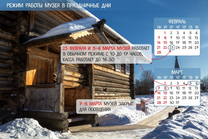 23 февраля, 5 и 6 марта музей работает в обычном режиме с 10 до 17 часов, касса работает до 16.30.