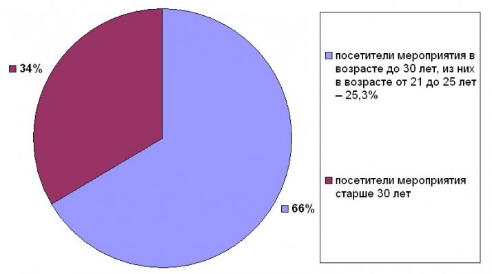 Среди гостей праздника большинство составили люди в возрасте до 30 лет, что соответствует 66,5% присутствующих. Из них в возрасте от 21 до 25 лет – 25,3%. Соответственно, оставшаяся треть посетителей были старшего возраста.