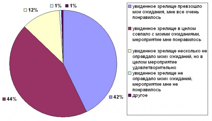 У большинства респондентов (44,6%) ожидания от праздника Широкой Масленицы в целом совпали с увиденным. Чуть меньшее количество гостей мероприятия (42,7%) отметили, что впечатления от праздника превзошли их ожидания, им все очень понравилось, что свидетельствует о высоком уровне подготовки мероприятия. Среди опрошенных были и те, кого мероприятие в целом удовлетворило, но несколько не оправдало их ожиданий (11,5%). Свое недовольство мероприятием высказали наименьшее количество опрошенных - 0,6%.