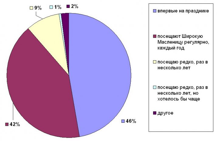 Результаты исследования показали, что большая часть посетителей мероприятия впервые на празднике, они составляют 47,2%. Немного меньшее число гостей ответили, что посещают Широкую Масленицу регулярно, каждый год (41,5%). Наименьшее число посетителей отмечают, что посещают мероприятия в «Семенково» редко, но хотели бы чаще (0,6%).