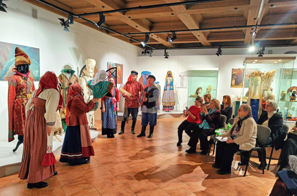 На исходе морозная зима, и она не торопится уходить. По народным представлениям её следует должным образом проводить. И тут в залах художественного отдела послышалась гармонь, зазвучали звонкие голоса, которые перенесли собравшихся в русскую деревню. Молодёжь в эту пору по дворам ходит, «виники-опарыши, голики- омётыши» на масленичный костёр собирает. Вот уж и чучело масленицы готово. Её, Масленицу дорогую, «Дуню белую, Дуню румяную», чествовали, величали, на двор широкой зазывали... Ожившие сцены из жизни деревни задали тон встрече, послужили своеобразной иллюстрацией к книге.