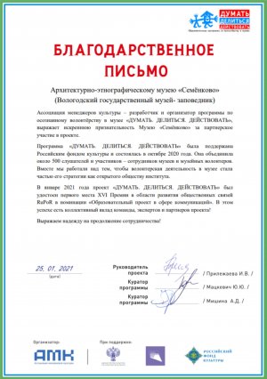 27 января 2021 года в Молодёжном центре ГорКом35 были подведены итоги работы Школы волонтёров музея «Семёнково» за 2020 год.