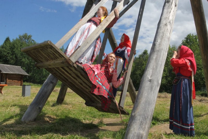 Закружила красота и молодость в задорных играх и широких хороводах. Понеслись озорные частушки, разряжая деревенскую округу шуткой и громким хохотом. А качели, словно маятники часов, отсчитывали в этот день время потехе и неродному гулянию. Надо было многое успеть: и в «лапту» сразиться, и «городки» наотмашь сбить, и яйца по желобкам на удачу покатать.