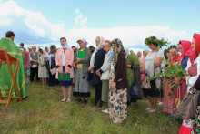 Шумными рядами, под звонкие наигрыши гармони и призывный колокольный звон, потянулись гости музея к Георгиевской церкви. Настоятель Храма Воскресения Христова посёлка Молочное иерей Иоанн Фомин совершил праздничный молебен прямо у стен храма великомученника Георгия Победоносца. Он осветил берёзовые веточки и поздравил молящихся с праздником Святой Троицы, желая, чтобы благодать Святого Духа пребывала с ними как можно дольше.