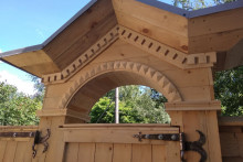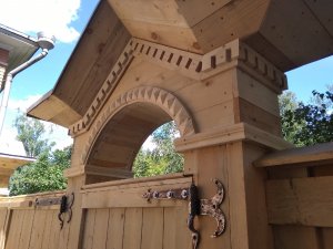 Теперь сложно пройти мимо этой красоты, не задержав взор на добротно выполненной работе. Массив из свежего дерева выглядит эффектно и самобытно благодаря использованным декоративным приёмам: искусно сделанной обшивке, деликатной резьбе по дереву, сохранённым кованным петлям и ручкам в виде колец. Украшением входа являются и причудливые арки с двух сторон от центральных распашных ворот, опирающиеся на деревянные колонны. Свежее, благородно-золотистое дерево в лучах солнца выглядит сейчас удивительно парадно и празднично. И мы не удивимся, если в скором будущем найдутся желающие из числа гостей нашего города, да и вологжан, кто захочет запечатлеть объект и сфотографироваться на фоне этой красоты.