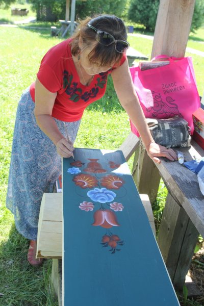 Одновременно с известным мастером в течение дня увлечённо работали учащиеся студии «Вологодские росписи». Они раскрасили заранее подготовленные силуэты сказочных грифонов. Один из них взлетел наверх расписного столба – указателя и занял на нём место флюгера. Другие грифоны ожидают продолжения Арт-сессии.