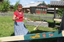 На этот раз гости музея увидели за работой мастера народных промыслов Вологодской области, хранителя Харовского историко-художественного музея - Петрову Галину Анатольевну. Она уверенными мазками виртуозно поставила на дыбы харовских львов, которые теперь зорко смотрят во все четыре стороны. Танцуют ли они при виде гостей или готовятся к нападению – судить вам.