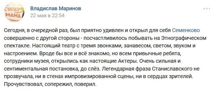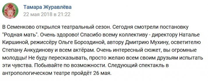 16 и 23 июня 2018 года в Антропологическом театре Музея "Семёнково" пройдёт спектакль «Родная мать»! Открыто бронирование билетов. Помните, количество мест в зрительном зале ограничено.