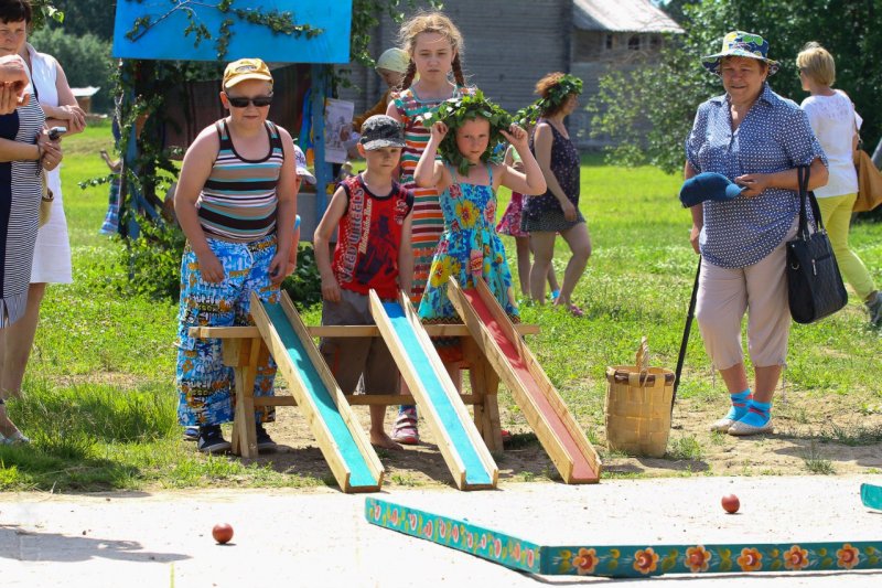 С 12 часов Троицкое гулянье развернулось на улице. Пришедшие гости не стояли в стороне: плели березовые венки, ходили по деревне рядами, пели песни, обходили дома, собирали яйца для будущей братчины. Качели, излюбленное место молодежи, не пустовали. На всю округу с них разносились песни и задорный смех. Парни и девушки заводили хороводы, играли в поцелуйные игры, знакомились и присматривались друг к другу. Многие соревновались в силе и ловкости: катали яйца по желобам, чистили картошку и бросали «Городки». Победители вознаграждались «семенковской» копейкой, на которую покупали в торговой лавке ленты, румянца и белильца.