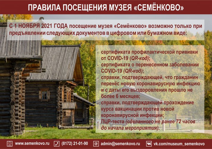 Уважаемые посетители! Обращаем ваше внимание, что с 1 ноября 2021 года в соответствии с Постановлением Правительства Вологодской области № 1154 от 08.10.2021 "О внесении изменений в постановление Правительства области от 16 марта 2020 года № 229" (далее – Постановление) посещение музея "Семёнково" возможно только при предъявлении следующих документов в цифровом или бумажном виде: