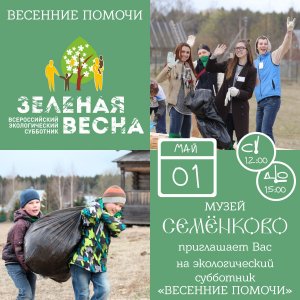 В этом году зима надолго задержалась в нашем северном краю, а потому впервые за долгие годы акция «Весенние помочи» пройдёт 1 мая! Давайте ударно, весело, озорно потрудимся в рамках Всероссийского экологического субботника «Зеленая Весна - 2019» и сделаем территорию музея «Семёнково» гостеприимной для многочисленных туристов и жителей Вологодчины. Нам предстоит с вами собрать остатки сухой травы; проститься с мусорным наследством, оставленным зимой, а также безжалостно расправиться с кучами слежавшегося снега!