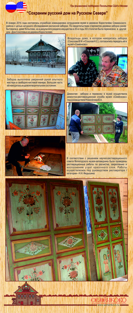 16 октября 2014 года в музее «Семёнково» состоялось подведение итогов проекта «Сохраним русский дом на Русском Севере», направленного на восстановление интерьеров дома Копылова из деревни Коростелёво Сямженского района.