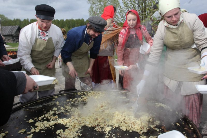 Парни вместе с гостями деревню обошли, яиц насобирали, а затем на большой сковороде яичную селянку приготовили. Уж так повелось, что Троица в исторической деревне «Семенково» всех собирает за единым столом, за братчиной.